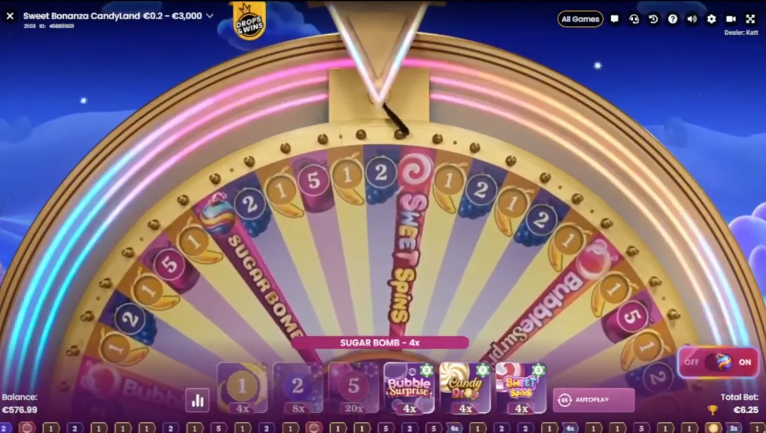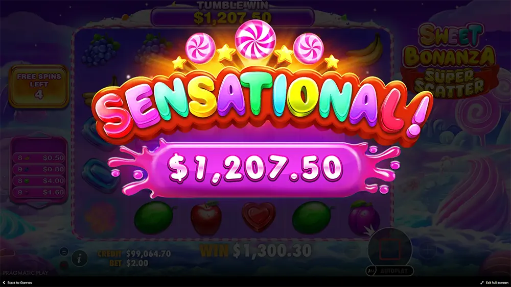 Hva er vel en spilleautomat uten en god bonus? Lander du 4 eller flere Lollipop-symboler, aktiverer du gratisspinn-runden – selve hovedretten i denne fargerike festen. Her kan multiplikator-symboler på opptil 100x dukke opp og virkelig sette fart på gevinstene. Du kan også aktivere Ante Bet (mer om det senere) for å doble sjansen din til å utløse bonusen